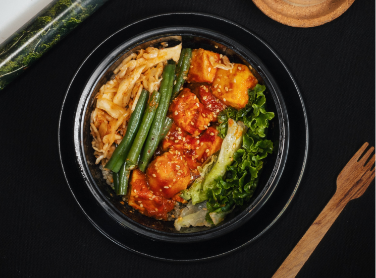 Modern fusion dish combining rice noodles with a classic rice bowl. Vegetarian option available.